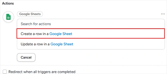 完成后,Uncanny Automator将显示其可以执行的操作。对于此设置,请选择“创建一行于Google表格中”。