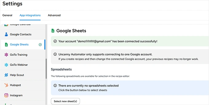 要开始使用,请转到 Automator » App Integrations,然后从左侧列中选择“Google Sheets”。