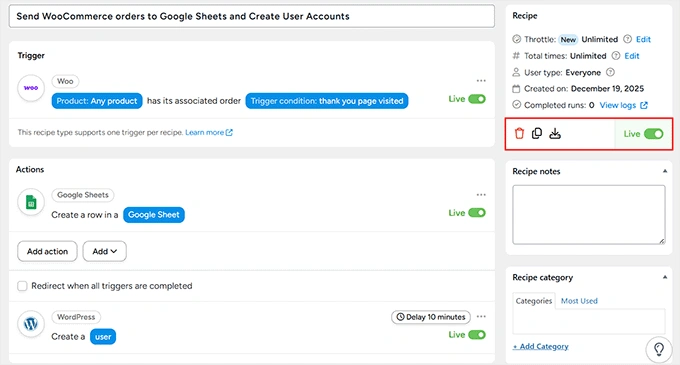 既然您的 WooCommerce 触发器以及操作——将订单数据发送到 Google Sheets 和创建新的 WordPress 用户——都已设置好,现在是时候让您的自动化上线了。