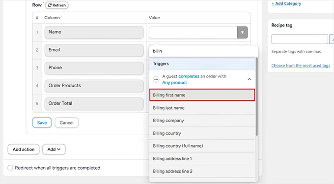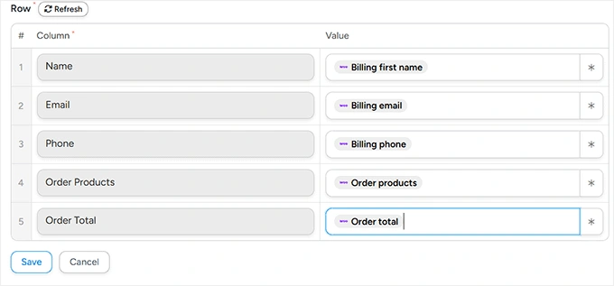 完成后,向下滚动到“行”部分。这是您将WooCommerce订单数据连接到Google表格中列的位置。