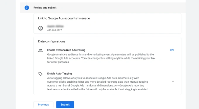 在下一步中,Google Analytics 将为您提供启用个性化广告和启用自动标记的选项。