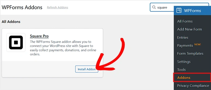 从您的 WordPress 仪表板,转到 WPForms » 插件页面。在插件列表中找到 Square 插件,然后点击"安装插件"按钮。