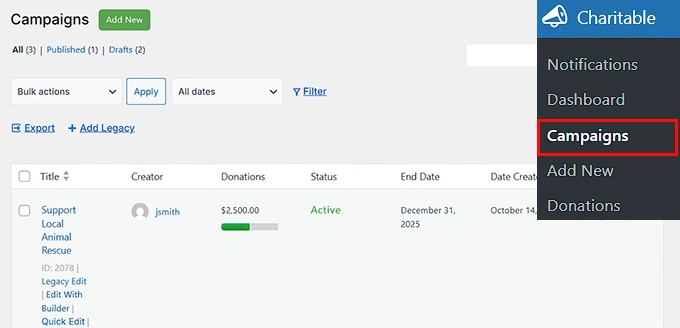 管理您的定期捐款同样简单。从您的 WordPress 仪表板,前往 Charitable » Donations 查看您活动所有的捐款记录。
