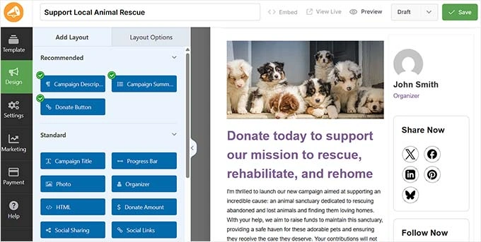 活动构建器打开后,您会在右侧看到捐赠表单的实时预览,左侧有字段列表。您可以拖放字段来重新排列它们,编辑现有字段,或删除任何您不需要的字段。