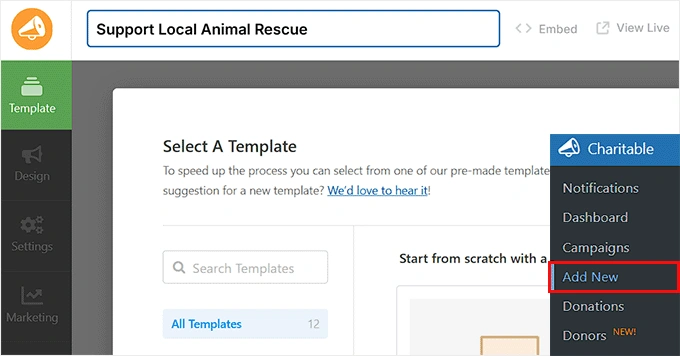 从 WordPress 仪表板,转到 Charitable » 添加新内容。这是您设置筹款活动和捐赠表单的地方。
