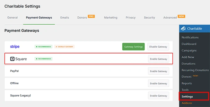 从 WordPress 仪表板,转到 Charitable » 设置 » 支付网关。您会在那里看到 Square。只需点击 Square 旁边的“启用网关”按钮。