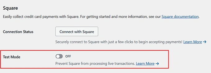 大多数 WordPress 支付插件,包括 WPForms、MyPayKit 和 Charitable,都允许您在测试或沙盒模式下测试 Square 付款,这样您可以模拟真实付款而无需实际扣款。