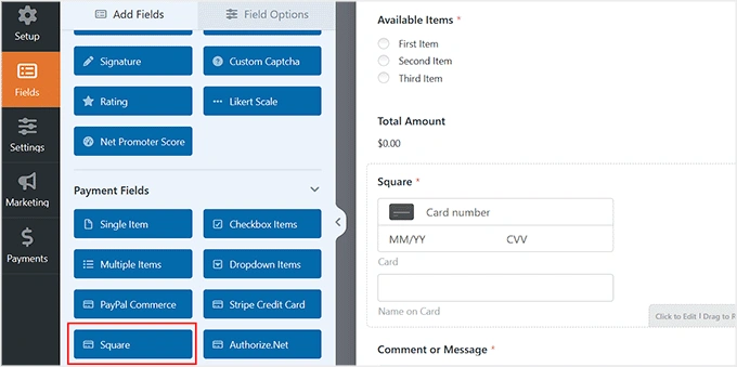 之后,请确保从左侧列添加“Square”支付字段。这是用户输入信用卡信息的字段。