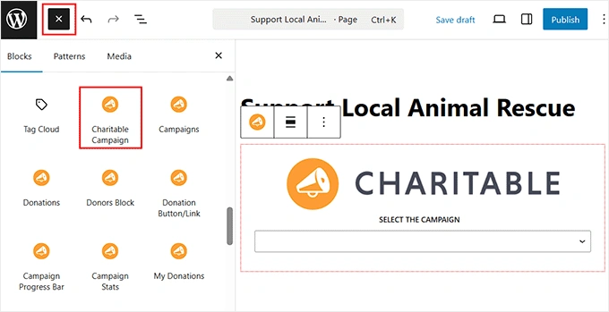 要在网站上显示表单,请在 WordPress 区块编辑器中打开任意页面或文章,添加“Charitable 活动”区块。从下拉菜单中选择你刚刚创建的活动。