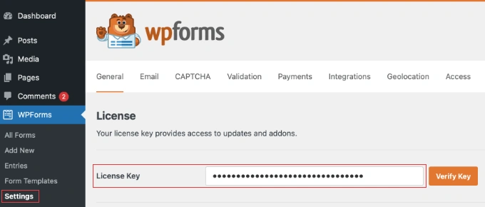 激活后,您需要输入许可证密钥。把许可证密钥想象成一个密码,它告诉 WPForms 您的站点被允许访问 Pro 功能和更新。