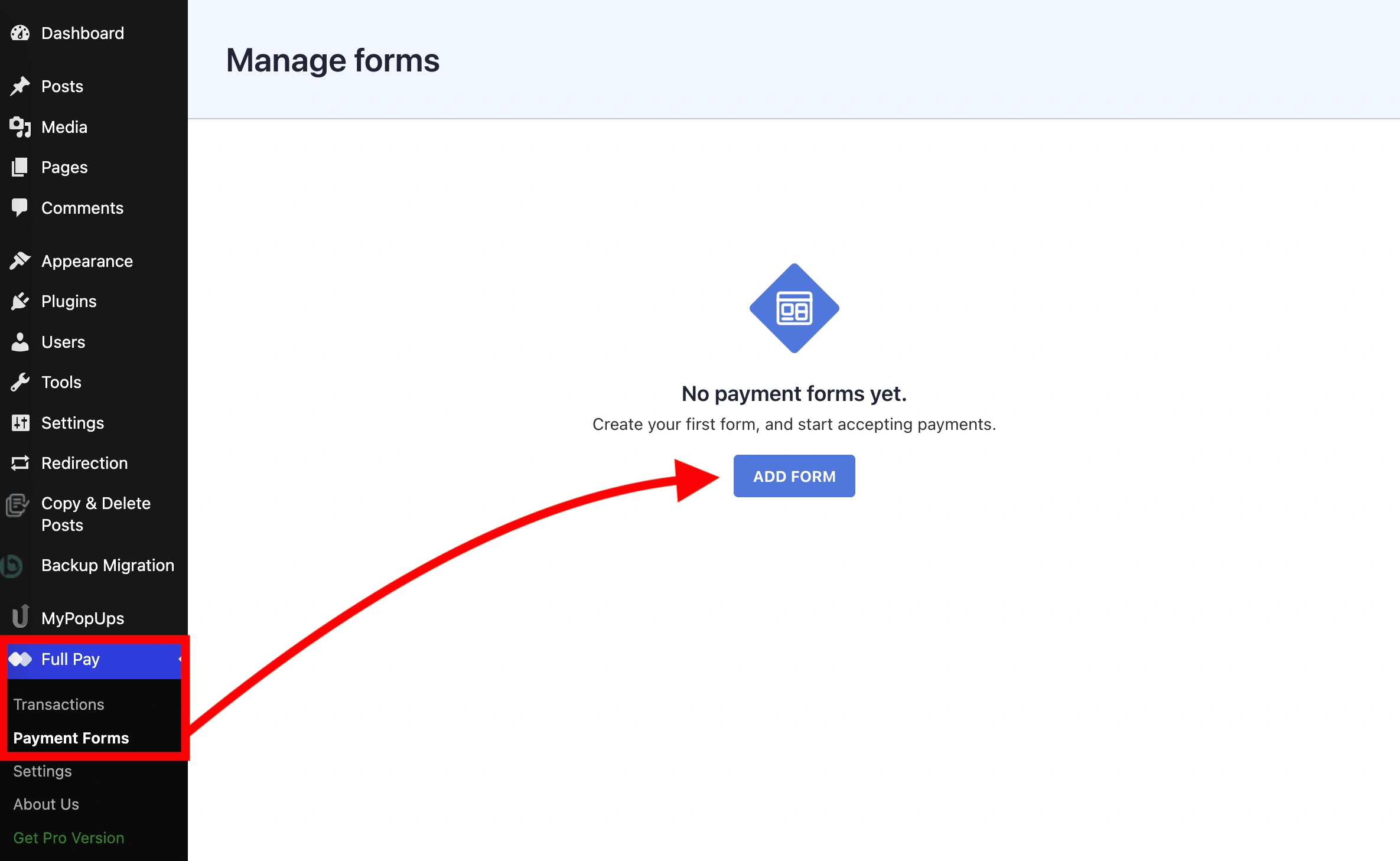 首先,将鼠标悬停在wp-admin菜单中的WP Full Pay上,然后点击支付表单添加表单