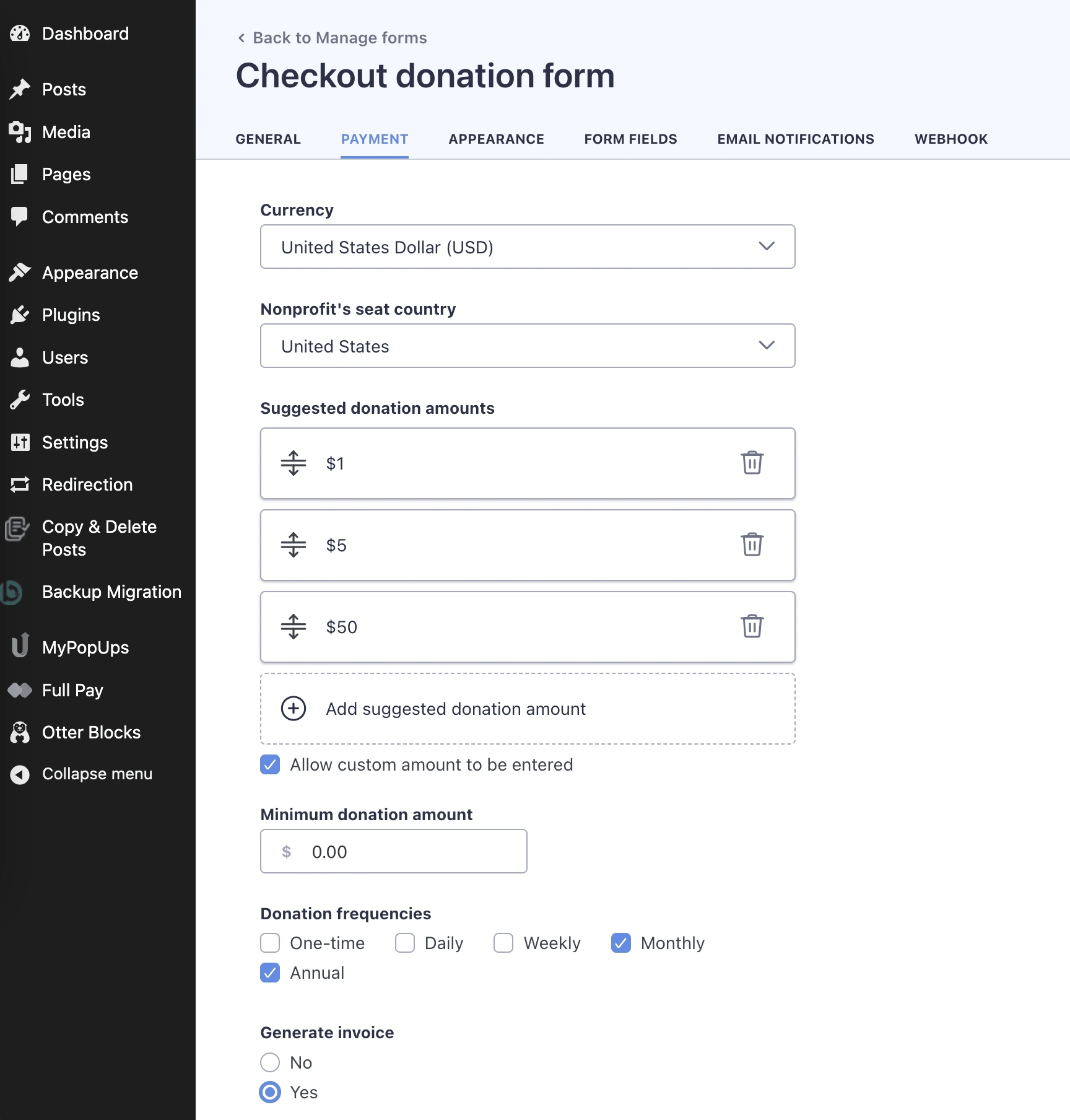 在页面底部,您还可以找到其他自定义选项,包括设置捐款频率以及为捐款者生成发票的功能。