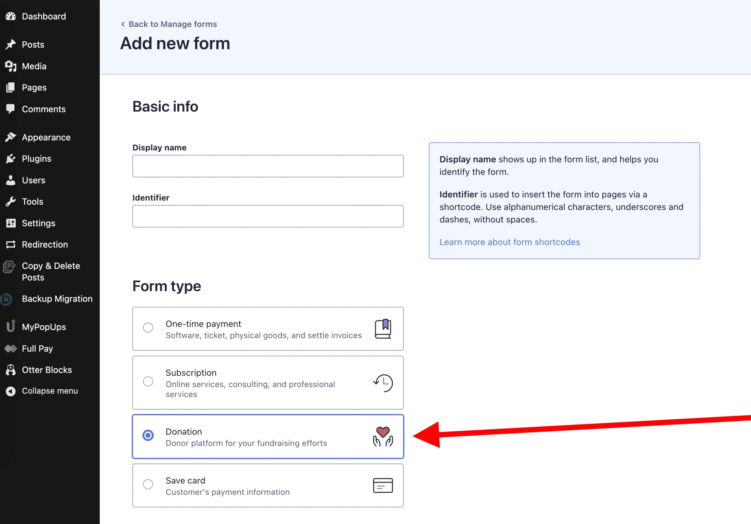 标识符字段将根据你在显示名称字段中输入的内容自动填充。它的作用是为与该表单关联的短代码添加标签。这个短代码是你将捐款表单插入到任何页面或文章中的方式——我们稍后会介绍这一点。