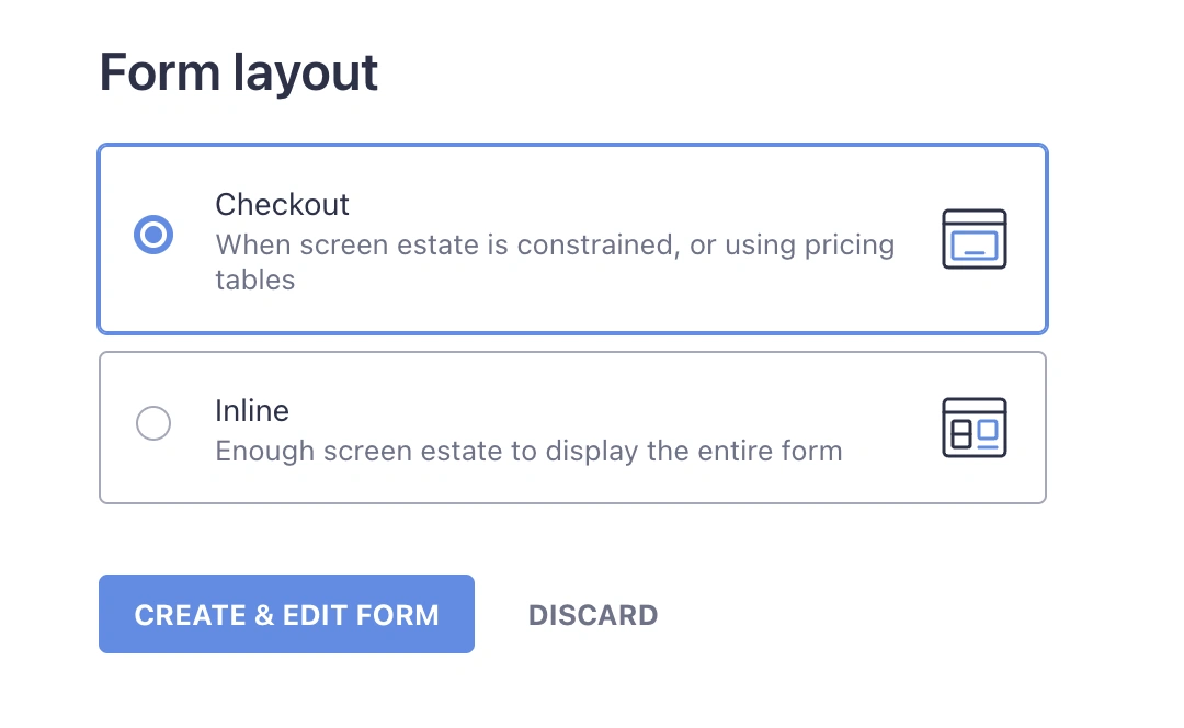 当然还有其他区别。例如,选择内联可以让捐赠者在页面上完成整个支付流程,而选择结账会将他们重定向到Stripe托管的专用页面。请查看这篇知识库文章,了解布局的完整比较。