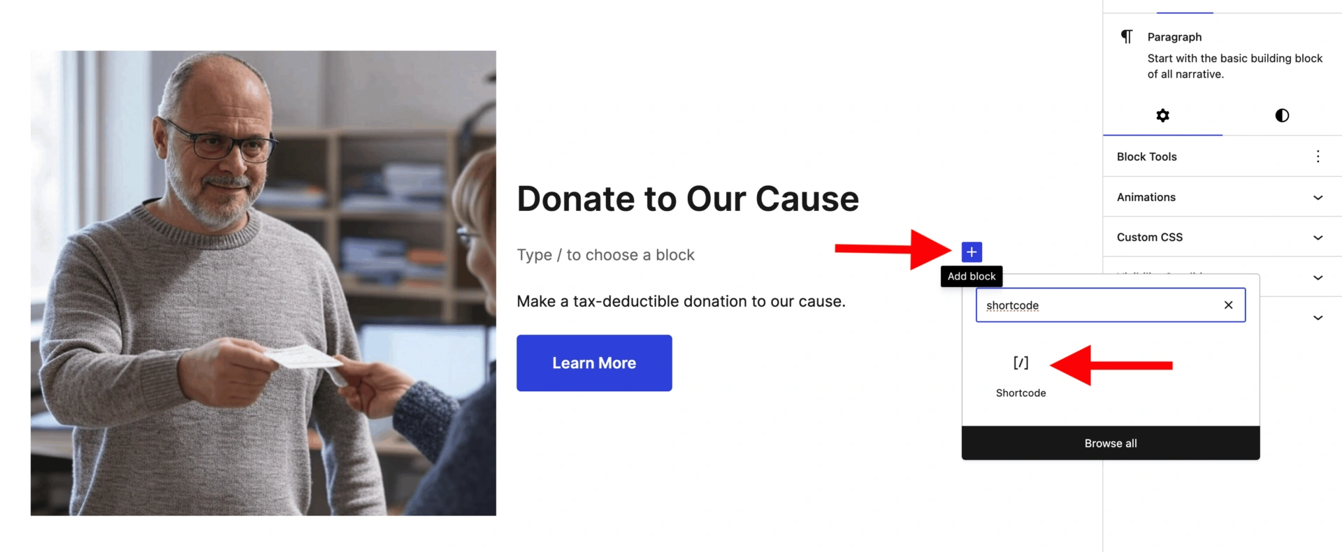 要将捐款简码添加到你的页面,请进入你希望插入它的页面/文章部分。