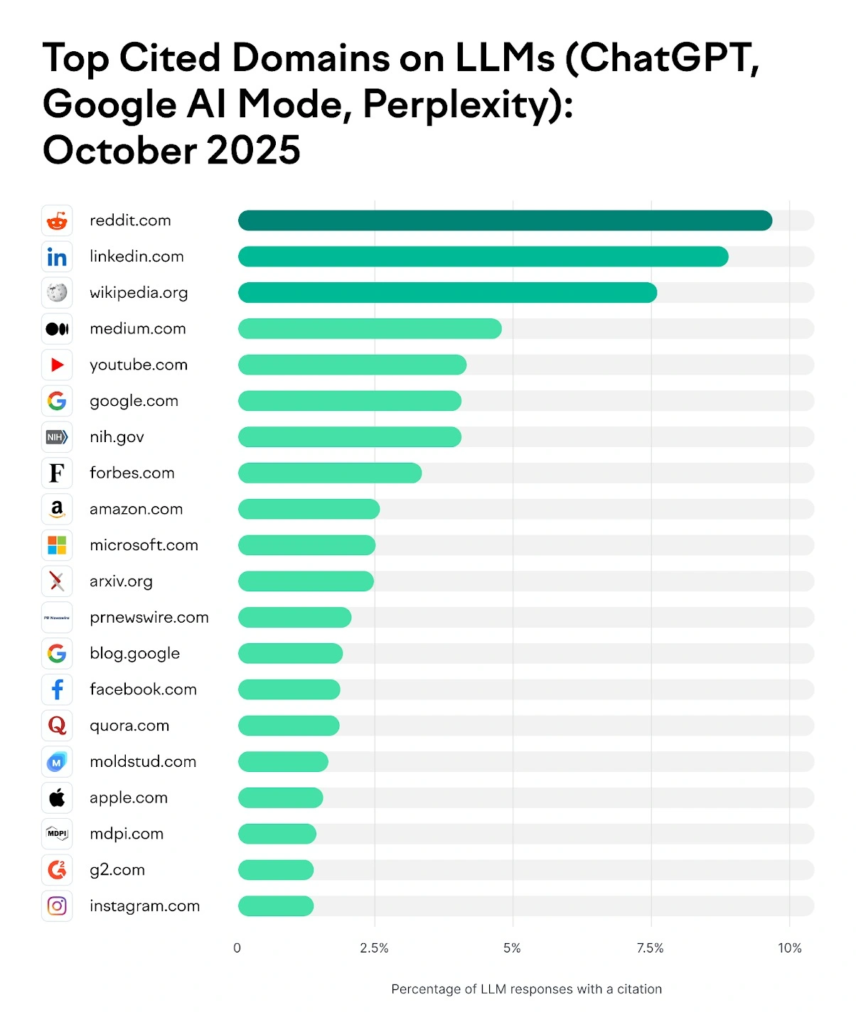 Perplexity 会扫描 Reddit 帖子和 LinkedIn 帖子。ChatGPT 倾向于依赖 Wikipedia 风格的权威性和长篇讨论。Google AI Mode 参考 YouTube 解释视频和 LinkedIn 的思想领袖内容。