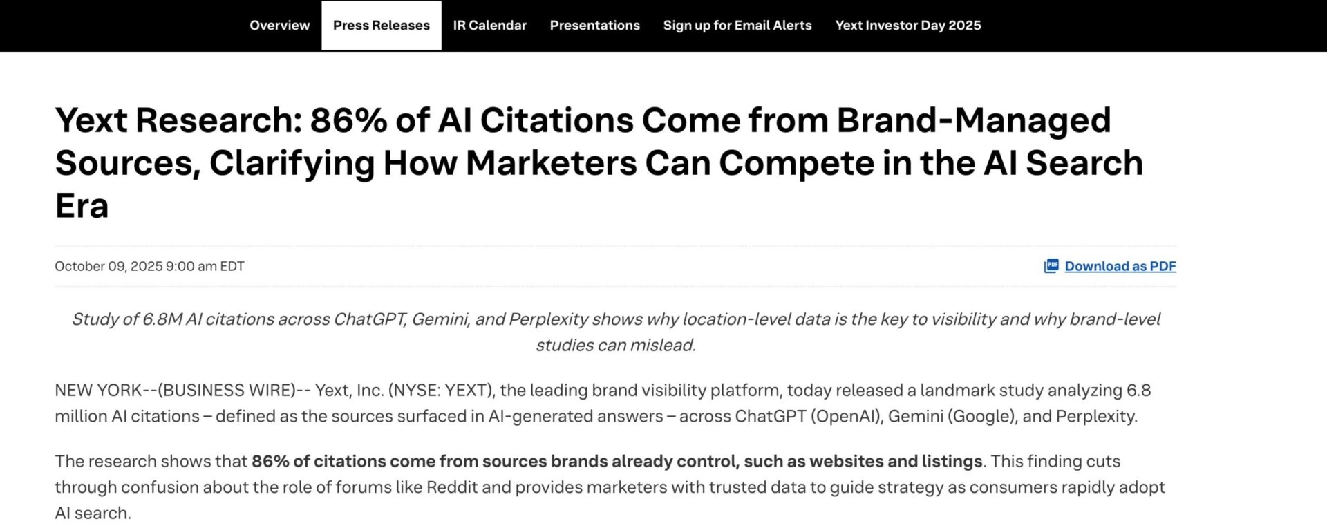 与此同时,Yext的研究表明,86%的AI引用来自品牌已经控制的来源,如他们的网站、本地列表和评论档案。