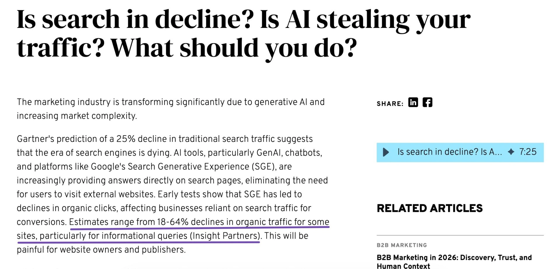 如今,AI 可以在不将用户引导到您网站的情况下满足信息意图。影响已经在数据中显现: