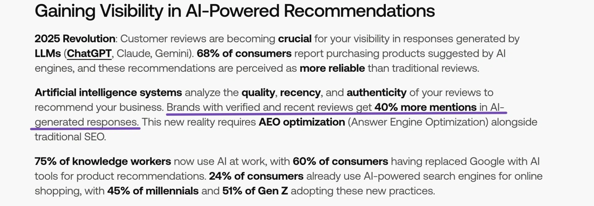 事实上,Digidop研究发现,拥有经过验证的最新评论的品牌收到的AI提及增加了40%,因为AI系统在生成推荐时会优先考虑新鲜、经过人工验证的信任信号。