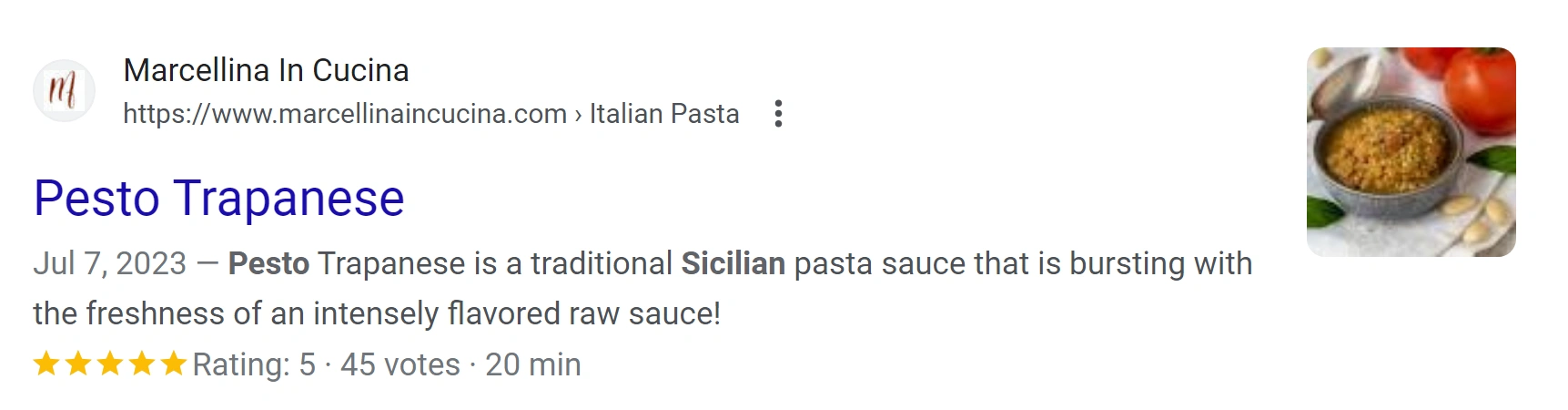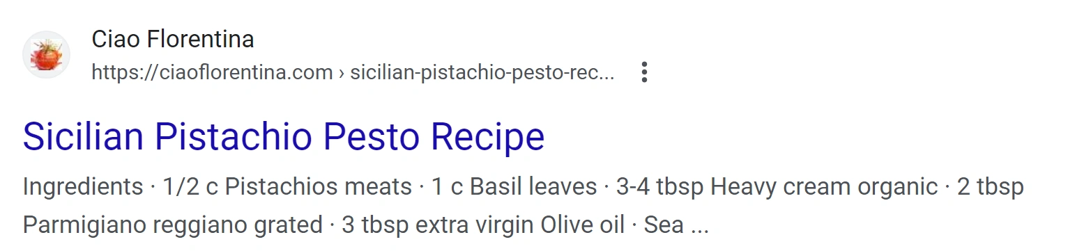 这些类型的结果是搜索引擎的基础。然而,Google还包含其他几种类型的条目。丰富摘要为“基础”结果添加额外元素,例如图片。对于食谱,您可以获取烹饪时间、评论数量和评级等组件。