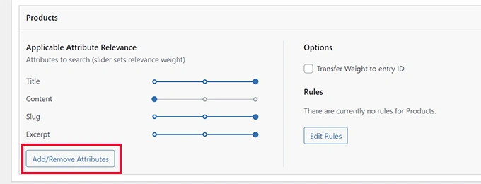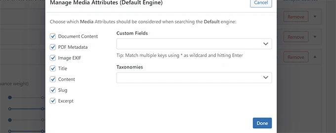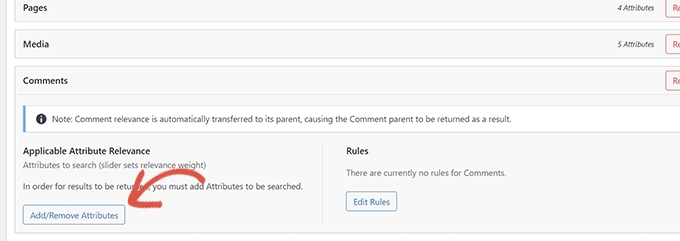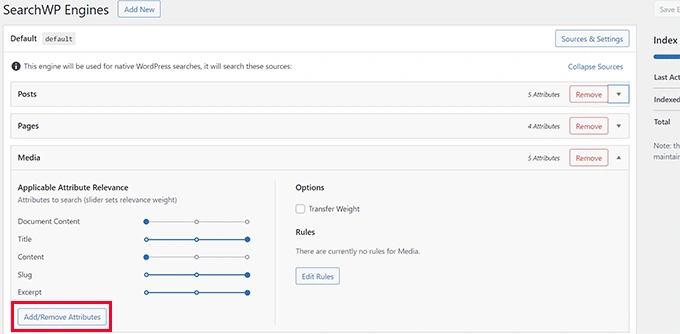 要在你的搜索源中包括自定义字段,请到 SearchWP » Settings页面,并点击一个源下面的添加/删除属性按钮。