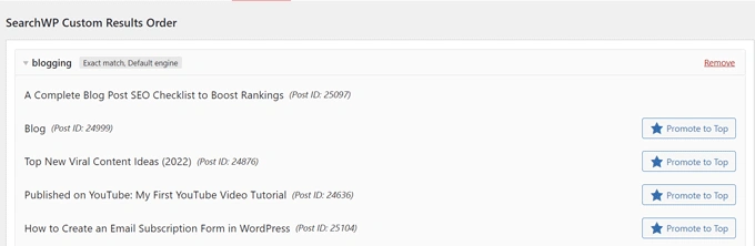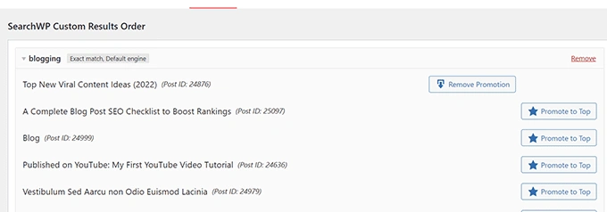 SearchWP将向你展示该特定查询的结果。你需要选择你想推广的内容,然后点击推广到顶部按钮。