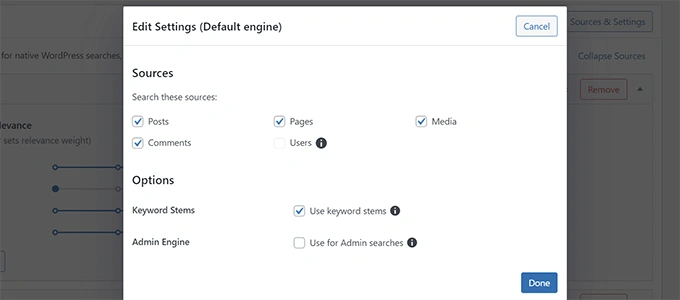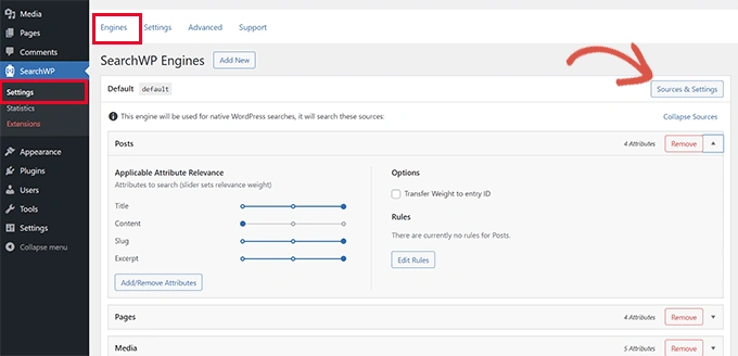 只需进入SearchWP » Settings页面,点击搜索引擎的来源和设置按钮。