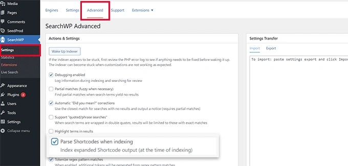 只需进入SearchWP » Settings页面并切换到高级标签。从这里,你需要勾选 "Parse Shortcodes when indexing "选项旁边的方框。