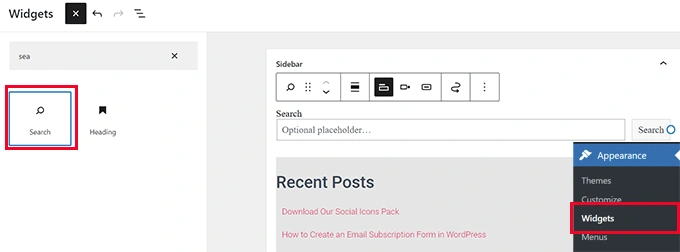 如果你的网站上没有搜索框,那么你可以通过访问Appearance » Widgets 页面添加一个。只需将搜索小部件或块添加到你的侧边栏,然后点击更新按钮,保存你的更改。