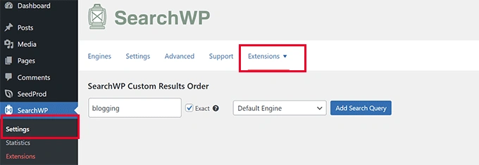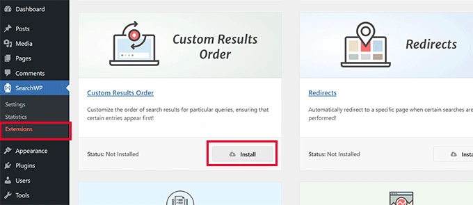 首先,你需要访问 SearchWP » Extensions 页面并安装 "Custom Results Order"扩展。
