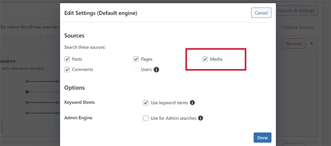 这将带来一个弹出窗口,你需要确保媒体被选为来源之一。