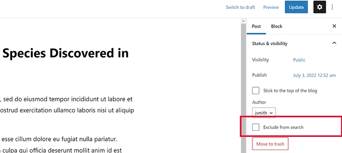 在编辑界面的 "文章 "面板下,你现在会看到一个从搜索结果中排除该文章的选项。