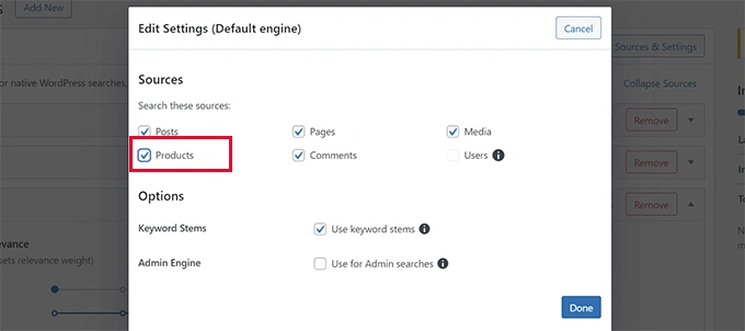 这将带来一个弹出窗口,你需要确保产品选项被选为来源之一。