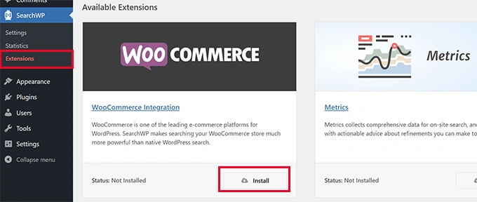 首先,你需要到 SearchWP » Extensions页面,安装WooCommerce集成扩展。