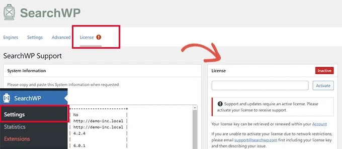 激活后,你需要访问SearchWP » Settings 页面,并切换到许可证标签。输入你的插件许可证密钥,你可以在SearchWP网站上的账户下找到。