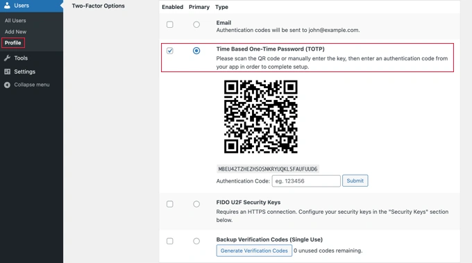 激活后,您需要访问“用户»个人资料”页面,然后向下滚动到“Two-Factor”部分。