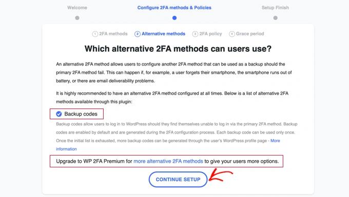 在免费计划中,仅备用代码方法可用。如果您想要更多的备用2FA方法,则需要升级到WP 2FA Premium。 WP 2FA备用2FA方法