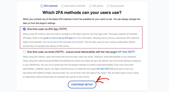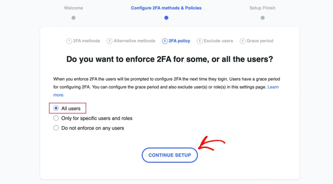 如果您想要强制要求网站上的所有用户使用2FA,则只需选择“所有用户”选项,然后点击“继续设置”。 强制所有用户使用2FA