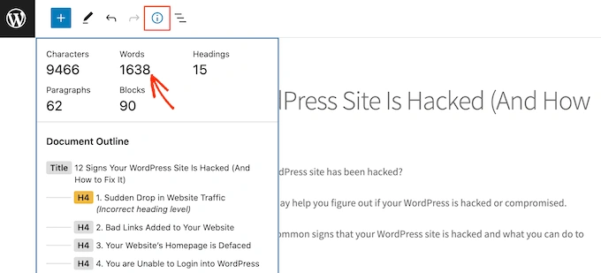 只需点击屏幕上方的 "i "图标,WordPress就会显示该页面或文章的一些基本统计信息,包括字数。