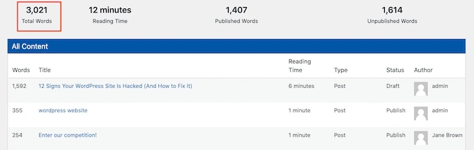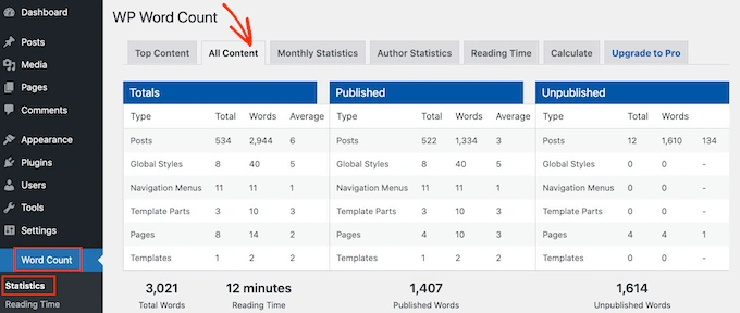 现在,无论何时你想看你的统计数字,你都可以进入Word Count » Statistics.。要查看您所有内容的总字数,请点击所有内容标签。
