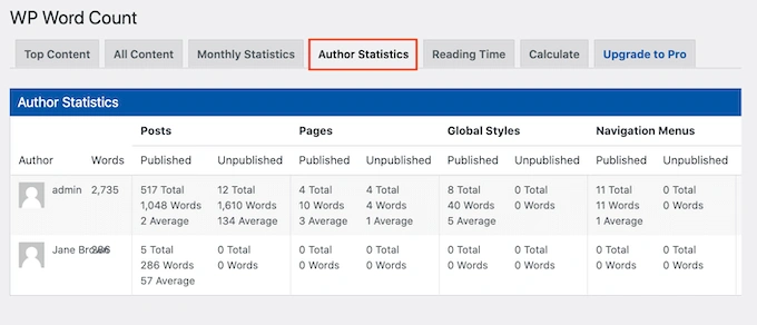 获得这些详细统计数字的最简单方法是使用 WP Word Count 插件。这个插件根据月份、作者和帖子类型显示你写了多少字。