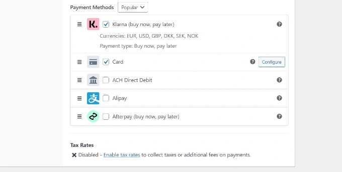 然后,您可以向下滚动到 "付款方式 "部分,选中您想添加到网站的付款方式旁边的复选框。
