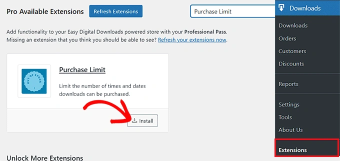 完成上述步骤后,访问 WordPress 仪表板上的Downloads » Extensions 页面。 在这里,您必须找到 "Purchase Limit"扩展,然后点击它下面的 "安装 "按钮。