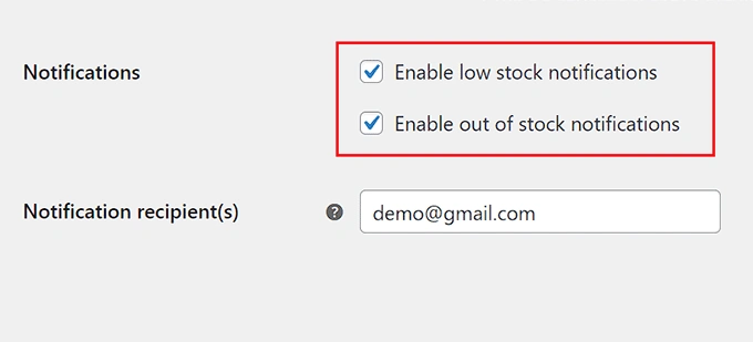 现在,当产品库存不足或缺货时,你就会收到电子邮件通知。 现在,您可以在 "通知收件人 "选项旁边添加希望接收这些通知的电子邮件地址。您也可以用逗号分隔添加多个电子邮件地址。