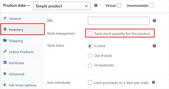 这将打开一个新界面,您必须向下滚动到 "产品数据 "部分,然后切换到 "库存 "选项卡。 然后,选中 "库存管理 "选项旁边的复选框。