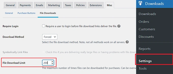 Publish or Update your digital product 如果您想为网站上的所有数字产品设置默认购买限额,可以访问 Downloads » Settings页面并切换到 "Misc "选项卡。