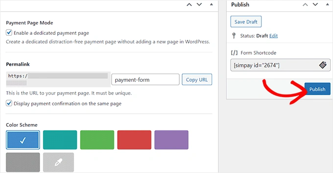 现在,您可以为支付表单创建一个自定义页面,方法是添加永久链接、配色方案、图片和页脚文本。完成后,不要忘记点击 "发布 "按钮来存储您的设置。