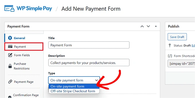 之后,您可以选择 "在线支付表单 "作为类型,然后切换到 "支付 "选项卡。