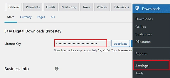 激活后,从 WordPress 管理侧边栏进入Downloads » Settings页面,输入您的许可证密钥。 您可以在 Easy Digital Downloads 网站的账户中找到此信息。