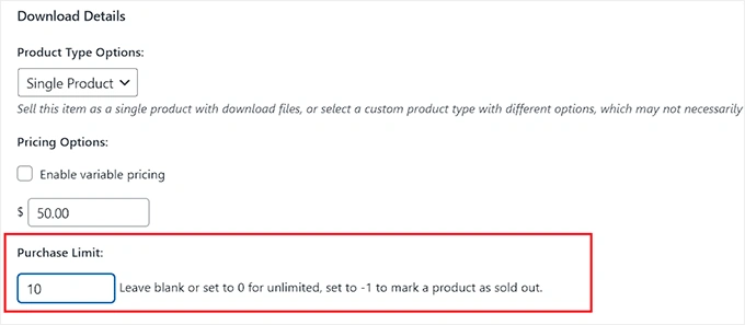 在这里,您可以在 "Purchase Limit"选项下输入您要销售的数字产品的数量。